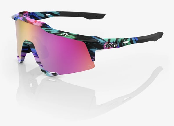 The Tie-Dye Collection is comprised of three sunglass styles—Peter Sagan Speedcraft (pictured above), Peter Sagan S2, and Peter Sagan S3—that each feature bright colors streaking across a black background, framing the bold purple triple-layer mirrored lenses. The emblazoned colors continue onto the temples, which also feature the 100% logo.