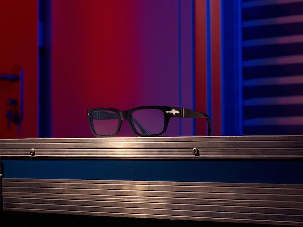 The optical styles pictured above—PO3303V, left, and PO3296V—were created with iconic rom-com characters in mind. The soft square shape features flex hinges, a keyhole bridge, Barberini lenses, and Persol’s patented Meflecto stem system on thin temples.