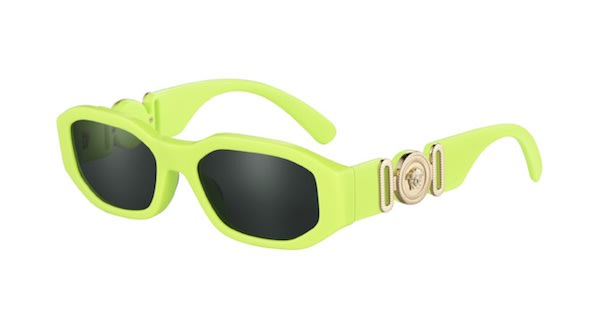 A mini-me version of Versace’s iconic Medusa Biggie design (VK4429U), this sun style, pictured here, features an irregular acetate shape with dark-grey lenses. Designed for both boys and girls, the frames are available with universal fitting for all needs in the colors fluo green or red.