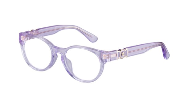Classic yet playful, the optical VK 3323U style, pictured here, features a panthos acetate shape and temples emblazoned with the Butterfly Medusa medallion—available in two sizes and three colors: transparent pink, fuchsia glitter, and black.