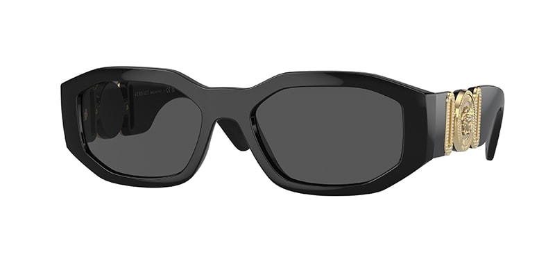 The Versace VE4361, pictured above, flaunts a dramatic rectangular silhouette with wide temples housing the gold metal Medusa medallion.