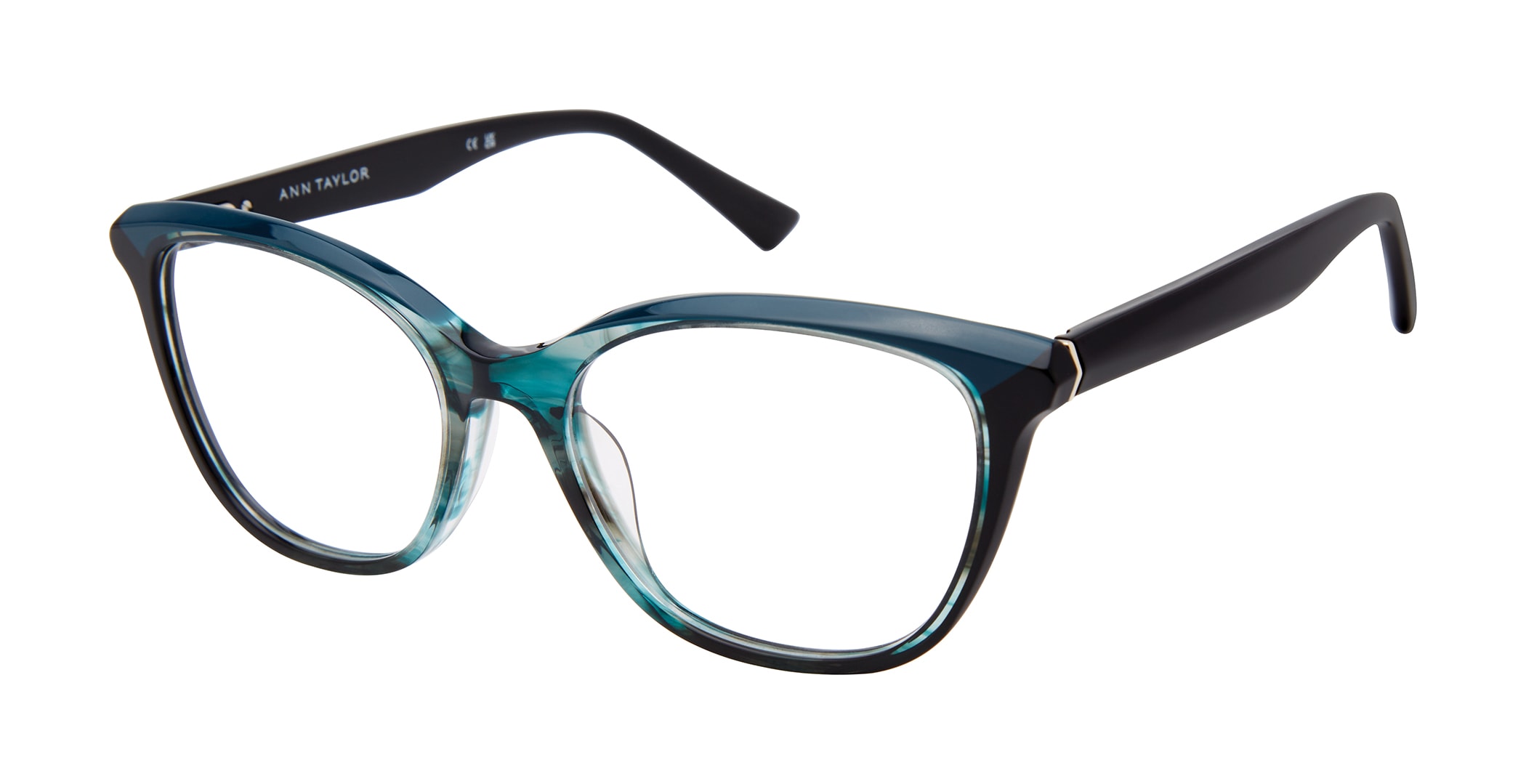 The AT354 is an acetate cat-eye optical style with bevel and color-blocked detailing, sculptural dimensional temples, and spring hinges—available in midnight tortoise/navy, horn/dark rose, and dark emerald horn/black.