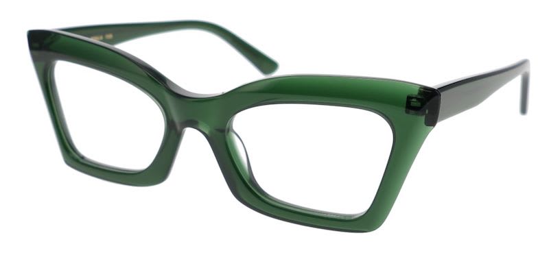 The Rosalia, pictured above, is an acetate frame featuring an Italian twist on the cat-eye silhouette—available in black demi transparent, dusty-blue transparent, pine-green transparent, and mauve milky.