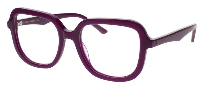 The Benedetta is characterized by a large, soft square acetate silhouette with upturned corners and a wrapped end piece—available in black, honey milky, fuchsia milky, and eggplant milky.