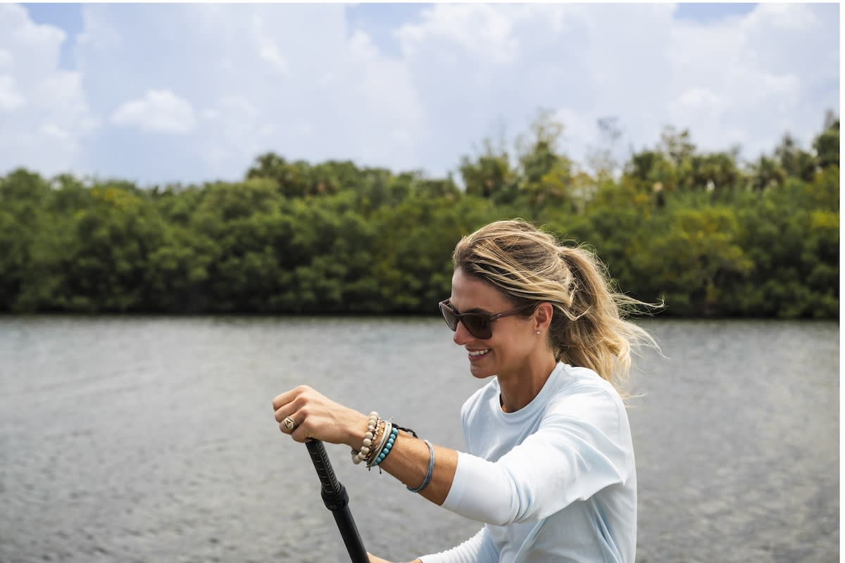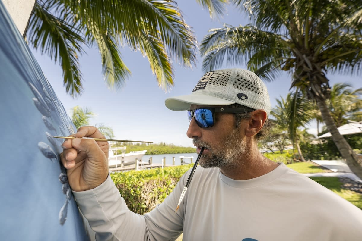 Costa highlights the connection between the sunglasses’ design and coastal lifestyle, exemplified by Florida-based artist KC Scott, pictured below wearing Trades, and his wife, Sarah Scott, pictured wearing Luna Nueva.