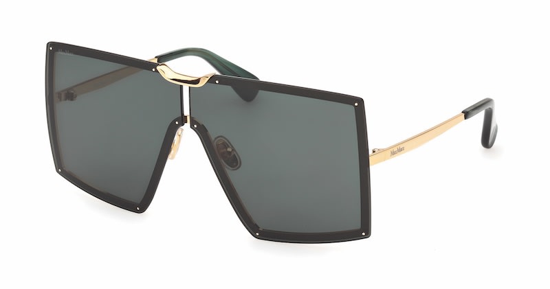 The MM0117, pictured above, is a rimless shield sun style with a dramatic oversized square silhouette trimmed with metal detailing above the bridge.