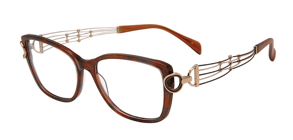The Quintet (XL2185), pictured above, is an oversized square optical style with a five-lined temple design, featuring a D-ring connecting the temples to the glittery acetate front—available in black, brown, and green.