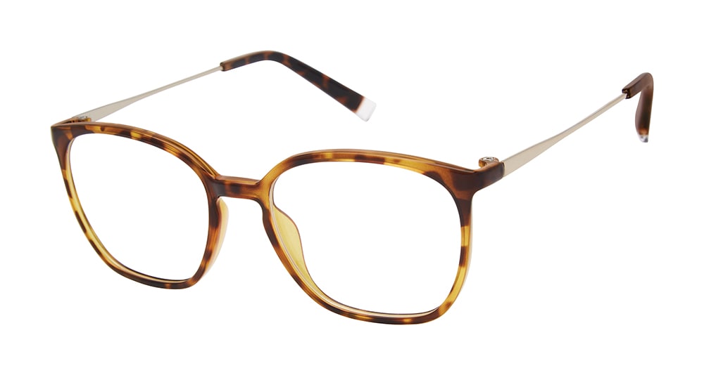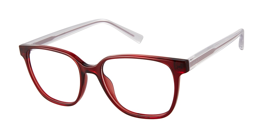 Pictured above, the ET33499 is a feminine square optical frame crafted from lightweight TR90 material, featuring transparent temples that expose the metal core wire.