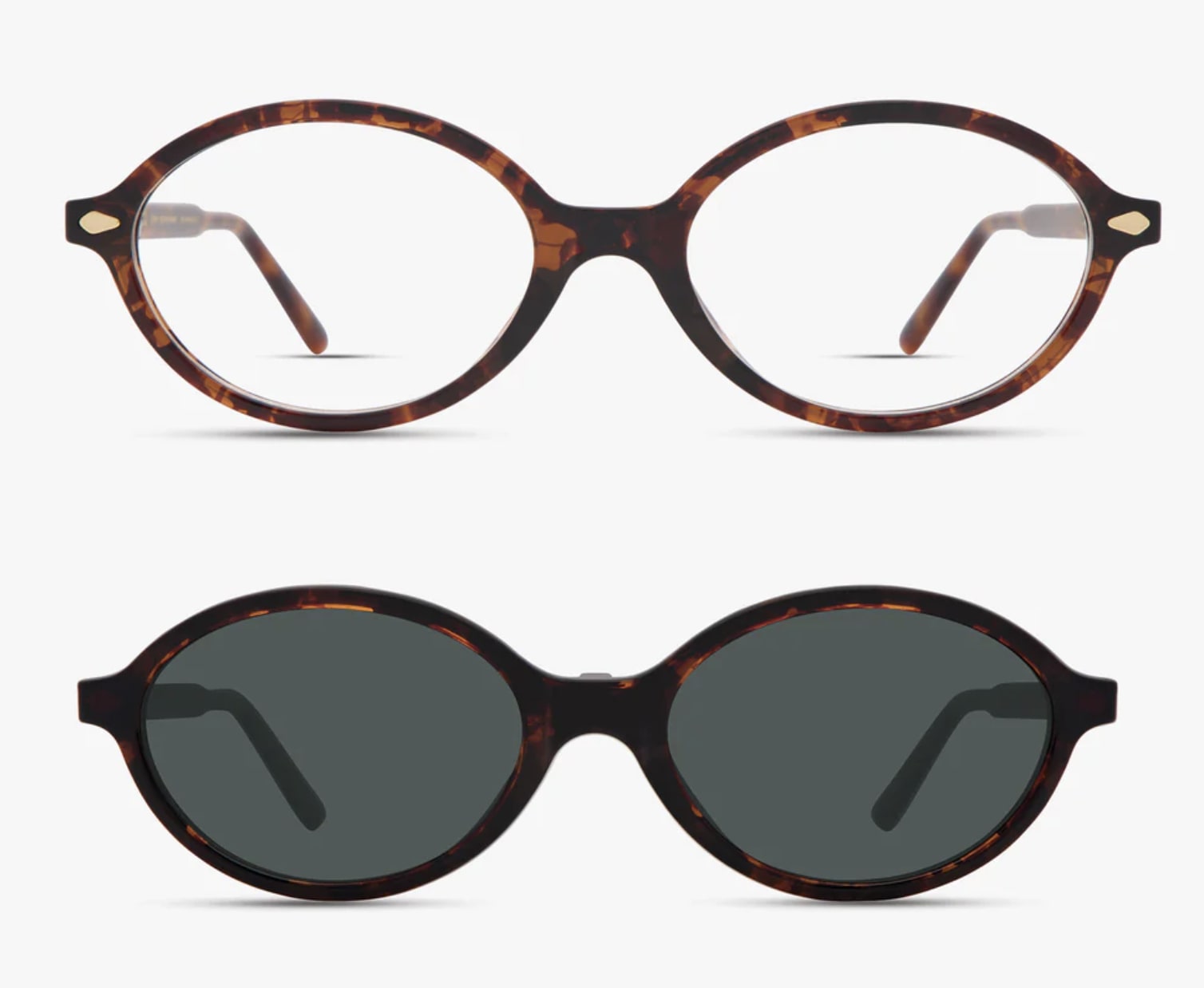 Pictured above, the Mirage is an optical style crafted from biobased acetate with a bold oval silhouette—available in dark tortoise, dark burgundy, champagne, and black with clip-on sun lenses.
