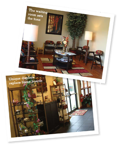 Gary: Instead of frame boards, we have glass shelves and mirrors on the back wall plus big, shelved display units in the center of the room from a local furniture store that are highlighted by interesting spotlights. We also used cherry wood desks instead of laminated dispensing tables. We probably spent less than $10,000 on all the furnishings.