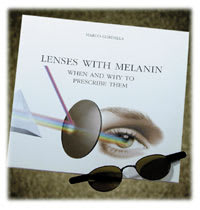 Melanin Dispensing Kit: Dispensing kit demonstrates melanin polarized lens which offers benefits for low vision, golfing, driving, shooting, and other applications. Kit includes melanin lorgnette and a book titled, "Lenses with Melanin: When and How to Prescribe Them," as well as a choice of coupon for a free pair of melanin prescription or plano lenses or $30 worth of coupons for melanin lenses. $30.