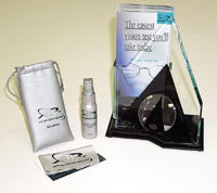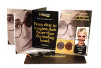 Lab Lens Demo Kit: Kit is initially available only for lab sales reps, but smaller kit for retail offices is being developed. Demo kit includes compact lightbox and carrying case for lab reps identify birefringence in polycarbonate lenses. Sales rep's display kit lets retailers test any polycarbonate lens against new Resolution. 2. Vision-Ease Lens (800-328-3449) Tegra Aspheric Polycarbonate: Display demonstrates scratch resistant coating; the thinner, lighter, and flatter design; impact resistance; and the aspheric benefits of more natural looking eyes. Coupons are provided to earn back the cost of the lens demo. $40. |
