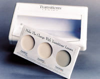 P-O-P Materials: Call to request a free brochure outlining what's available and select option "three" for Transitions customer relations. The following materials are available: Patient brochures, available in packs of 50; patient brochure holder; Use and Care Guide detailing how to care for Transitions lenses, available in packs of 50; dispensing mats; cling applique for doors or windows; lenticular with countercard demonstrates variable-tint aspect of Transitions lenses; UV posters about effects of UV exposure; UV countercard; two-sded posters featuring ads from Transitions print campaign. UV Light Demonstrator: UV Light Demonstrator shows patients how lenses activate-without going outside. Includes two up-dated tint cards to coordinate with other P-O-P materials. $115.