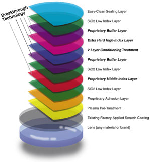Seiko Optical. Its new 16-Layer High Impact Process (HIP) for its AR coating improves adhesion while significantly reducing crazing, peeling, and scratching. Its coatings are index matched to each material, and the 16-layer process includes a primer, hard coating, eight layers of AR, and a hydrophobic top. The uniform index of lens material and coating is reported to eliminate rainbow reflections and includes a hydro sealer.