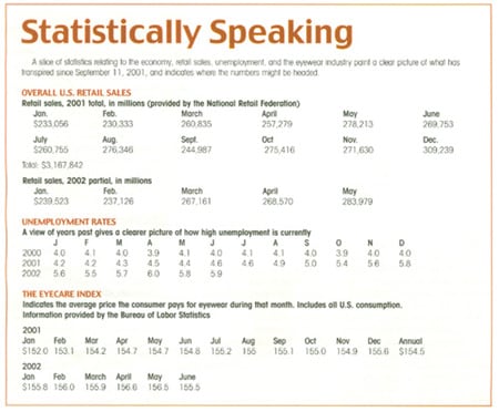 Recent data shows the U.S. economy continuing to improve. This improvement, however, has been carried on the shoulders of the consumer--who, according to Carmetrics, a forecasting and analysis company for the auto industry, accounts for roughly two thirds of overall economic activity. The company predicts consumer spending will remain strong throughout the remainder of 2002, enabling other sectors of the economy to recover as well. This consumer-fueled boost has provided a jumpstart to industries, including eyecare. Still, the optical market appears to be somewhat less severely impacted by the current recession than many others.