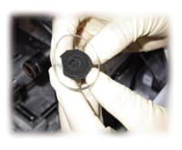 (Left) Trivex is a strong choice for a drilled rimless frame. (Right) Trivex lenses including Younger's Trilogy should cool for 30 minutes prior to generating |