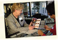 This store manager utilizes comparative photos and Transitions Optical's UV demonstrator to show the benefits of anti-reflective coating and