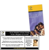 Check Yearly. See Clearly. offers a variety of educational materials on the importance of exams, including the popular "Look Out for Your Family's Vision" brochure. The program also provides free eyeglass case insert cards that remind patients why exams are important for children, baby boomers, and seniors.