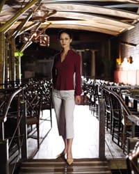 | Oriental Opulence. Coach style Hailey for Marchon. Light green beaded tank and pleated gold skirt by Banana Republic | Sleek Styling. Gucci style CG 2706 for Sàfilo. Burgundy top and tan pants by Banana Republic |