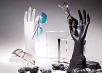 Shown top: A hand display from Magic Design/Visual Dynamics can be used in sunwear promotion. Below: A glass case such as the Provence Showcase from Fashion Optical Displays can display sunwear |