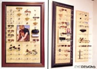 If you don't have a big display area, use a floor-to-ceiling display case. The key is to use as much vertical space as possible. For example, if you are going to have chairs along the wall for people to sit in, you can put shelves safely over the chairs. You should also use your waiting room space to show off frames.