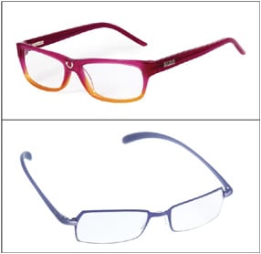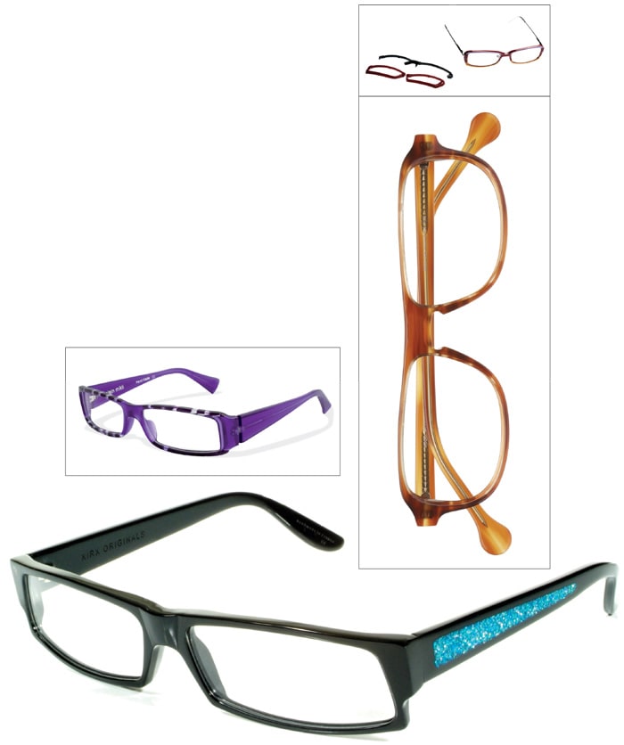 Mido was a showplace for colors, patterns, and eye-catching options. Shown clockwise from top: United Colors of Benetton's latest offers snap-on options; a keyhole bridge adds retro flair in Modo style 205; a splash of glitter in Kirk Originals style Wilbur Jet J206; purple and patterns from Alain Mikli's new purple Pact collection. Shown is style A0777-97