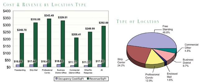 | While the charts at the bottom of this page and the top of the next refer specifically to the location type, cost, revenue, and space allocation breakdowns of Cleinman Performance Partners, Inc.'s client base, they could mirror what the optical industry looks like. Of note is that in terms of location type, the largest number of survey respondents (46.8 percent) were situated in freestanding locations, followed by strip centers (24.2 percent), and professional condos (12.9 percent). Source: Cleinman Performance Partners, Inc. 2005 Space Utilization Survey (results from client base in 23 U.S. states and Canada) |