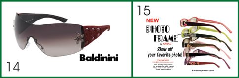 12 The new Bloom collection from Face a Face offers a two-tone acetate front designed and sculpted like a butterfly, giving all the styles a glamorous and charming retro look. The sculptural effect is obtained through 3-D milling followed by a careful hand polishing process. The collection also features a hidden spring hinge and two-tone color range. Face a Face: + 33 1 56 33 34 43, www.faceaface-paris.com Booth: Suite 13 First Insight is unveiling its maximEyes practice management and electronic medical records software. Through maximEyes, ECPs can submit regulatory-compliant e-prescriptions to pharmacies; use its 3-D Precision Draw to capture anterior/posterior segment data and illustrate health concerns; generate a playlist of educational videos based on diagnosis codes; and download/import ERA. First Insight Corporation: 800-920-1940, www.first-insight.com Booth: MS7075 14 The fall collections of the Baldinini, Alviero Martini, Kiton, and Mariella Burani eyewear lines will be shown by their exclusive U.S. distributor, Grant Italia. The design house Baldinini has recently added eyewear to its line of bags, accessories, shoes, and outwear, and the entire collection will be waiting for Expo buyers to see. Grant Italia: 800-828-0060, www.grantitalia.com Booth: G18012 15 Kimiko, Ltd. has extended its line to include the much-anticipated Photo Frame. Using patented graphic technology, images can be vividly printed on a frame's temples. Customers can now show off their favorite images or photographs on any frame. There is no inventory or equipment necessary; ECPs just send the image and frame to Kimiko to be printed. Kimiko, Ltd.: 718-368-9111 www.kimikoeyewear.com