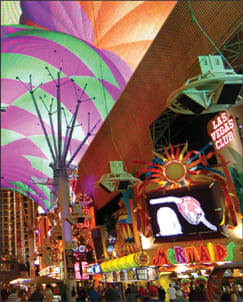 ■ Fremont Street Experience: The famous, casino-lined Fremont Street has been converted into a massive pedestrian area covered by a continuous canopy studded with more than 14 million lights. It is the canopy itself that delivers the show here; sound-and-light extravaganzas like "American Pie" and "Queen Tribute" pulse through the canopy and the 550,000-watt sound system here throughout the evening.