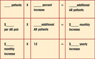 | Industry averages indicate AR represents $60 of added revenue per sale. A practice that bumps AR from 26 percent to 40 percent of sales could experience a $12,240 jump in annual revenue. D.I.Y.: Increase your AR by your target percent. How does this affect your revenue/month?