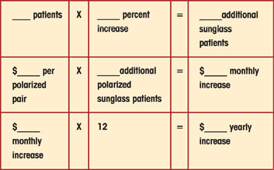 | In the typical practice, a pair of polarized sunglasses yields $250 additional revenue. Using the same basic formula, increasing polarized from 8 percent to 15 percent yields an increase of $2,000 monthly and $24,000 yearly. D.I.Y.: Increase your polarized from X percent to Y percent. How does this affect your revenue/month?