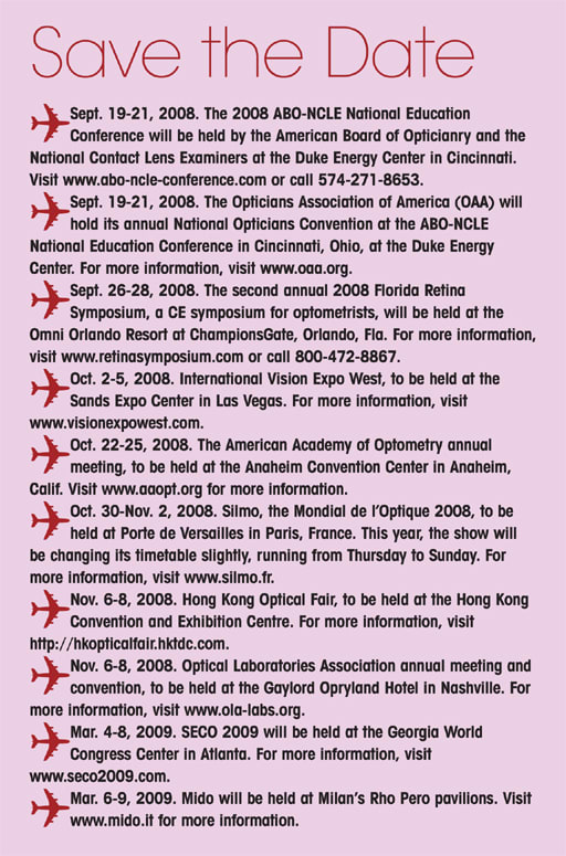 The American Optometric Association (AOA) presented its annual awards at the 111th Annual AOA Congress in Seattle, Wash. The 2008 AOA Award recipients are Arol R. Augsburger, OD, of Chicago, Distinguished Service Award; Linda D. Johnson, OD, of Jackson, Miss., Optometrist of the Year; Elizabeth Draper Muckley, OD, of Uniontown, Ohio, Young Optometrist of the Year; Mr. James Kesteloot, of Chicago, Apollo Award; and Beverly Roberts, CPOA, of Magee, Miss., Paraoptometric of the Year Award.
