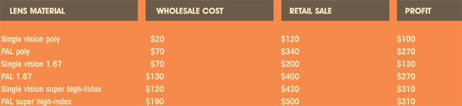 Approximately how much more can you make if you upgrade from clear polycarbonate to a clear higher index lens? Check it out:![]() ![]() High-minus prescriptions offer a great opportunity to "wow" customers. Photo courtesy of Robert Marc |