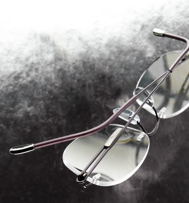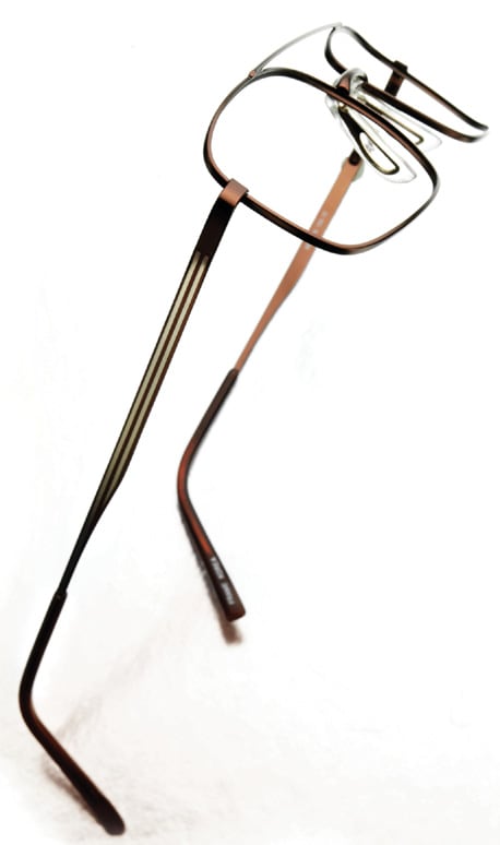 | Rx: OD -1.00 +0.50 × 005 OS -1.00 +0.25 × 160 ADD +1.50 Lenses: Trivex or 1.67 index; AR; PAL; edge polish; photochromic optional. Trivex or 1.67 index lenses feature easy edging for semi-rimless frames with wearing comfort and durability. AR and PALs keep the sleek theme of this metal design. An edge polish with brown photochromic lenses adds to the style. Frame Highlights: This updated traditional look gives a youthful spin to the boomer eyewear consumer. A textured temple with thoughtful, masculine detail work provides a depth and edge to a light-weight semi-rimless look. |