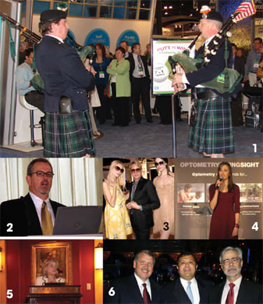 1. Essilor's bagpipers play for Essilor Crizal Alizé with ScotchGard Protectant; 2. Essilor of America's Mike Daley at their press breakfast; 3. Fashion guru Carson Kressley guest emcees Safilo's Saturday fashion shows; 4. Broadway's Laura Osnes performs a selection from her "Grease" role at the Optometry Giving Sight event; 5. Corinne McCormack introduces The Vision Council's Eyewear and Accessories division trend presentation; 6. At the Eyes on New York gala, honorees (l-r) Rick Elias of Transitions Optical and Julian Gangolli of Allergan pose with David Heath, OD, Ed.M., of SUNY College of Optometry. 7. At the Jimmy Choo launch party (l to r): Safilo's Brian Henke, MaryBeth Trommelen, Robin Ettinger, and Bill Harrison; 8. At the Charmant anniversary cruise, guests from Bard Optical of Peoria, Ill.; 9. EyeRock musicians (l to r): Steve Santinelli, Santinelli International; Robert Shanbaum, Ocuco; and John Alofs, ROI; 10. Peter Friedfeld greets guests at the ClearVision BCBGMaxazria shopping party; 11. Douglas Hepper (l) and Jay Lusignan from Vision-Ease Lens discuss green initiatives; 12. Essilor of America's Howard Purcell, OD, in his new role: vice president of customer development, 13. A&A Optical's Robert Liener with Mary Ozga of Marion Eye Center in Marion, Ill., the winner of a WIN BIG HDTV Giveaway; 14. The UJA's honoree Jerry Hayes gets his award from Marchon's Larry Roth; 15. Randy Jackson (l) and Jamie Shyer at Zyloware's booth; 16. At the WaveTouch CL press event (l to r): Ray Sievert, Tracey Technologies, Kevin McNaught, Sandra Zuccaro Keyes, and Kevin Bligh from WaveTouch; 17. A model on Revolution's runway; 18. Santinelli International's rimless workshop; 19. "Mastering Rimless Eyewear Assembly and Dispensing" workshop with EB's Alex Yoho; 20. B&L's Gerald Ostrov details the company's charitable initiatives; 21. Jeff Hopkins at the Carl Zeiss Vision Compact ULTRA MINI Cooper S grand prize drawing; 22. Raanan Naftalovich (l) of Shamir Insight and Eyal Hayardeny of Shamir Optical Industry Ltd., announce Shamir's revitalized Autograph line; 23. Under the EyeRock spotlight (l to r): Paul and Jason Shyer, Eastern States Optical, and Mike Cooper, Tri-Supreme Optical; 24. Signature Eyewear's Michael Prince (l) with Carmen Marc Valvo at the launch of the designer's eyewear line; 25. At the BowlMor party (l to r): Terri Nesrsta from Essilor, John Lahr, OD, from EyeMed Vision Care, Anne Marie Made, OD, Jerry Ventura, and Danne Ventura from Essilor; 26. Accessories Council honoree Marge Axelrad of Jobson Publishing with her award; 27. A collection of Olympic torches at Marchon's booth; 28. Live's Kieran Hardy is bearish on Live's new low vision collection; 29. At the iRx Polaroid booth with a fundraising car; 30. Representatives from Mido announce changes; 31. Eli Manning greets fans at the Revolution booth; 32. "Power Panel: Maximizing Your Dispensary's Potential" moderated by EB's Karlen McLean; 33. Mario Lopez at Revolution's booth; 34. PSI's Karen Gillen (r) joins Saint-Gobain Performance Plastics' Geoffrey King launching SecurEdge Plus edging pads. 35. McGee Group's Sally Hansen launch celebration, (l to r): Holly Autorina, Wayne McGee, Paula Meason; 36. Stephanie De Long's Pleiades award acceptance speech at the Optical Women's Association networking social; 37. The women of EB cheer De Long on at the OWA event.