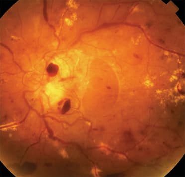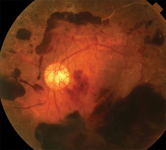 Top: Proliferative diabetic retinopathy (PDR) with extensive retinal hemorrhages and neovascularization of the optic nervehead Bottom: Severe proliferative diabetic retinopathy (PDR) with hemorrhages, exudates, neovascularization, fibrosis, and traction retinal detachment |