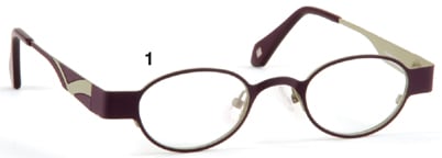 | 1. Cinzia's Irreverent in purple metal lends a contemporary twist with its bold color and temple design: www.cinziadesigns.com, 800-701-6765; 2. A twist on semi-rimless, with the rim on the bottom, plus a pop of color, make California Accessories' Bistro in blueberry stand out: www.calaccessories.com, 800-523-5567; 3. Hilco serves up some multicolor fun with its painted style, HP301: www.hilco-usa.com, 800-955-6544; 4. The retro look is made soft and feminine on Amy Sacks style Diane in taffy: www.amysacks.com, 877-274-0410; 5. Corinne McCormack livens things up with a fun pattern in pretty shades of red and brown in the Checkerboard style: www.corinnemccormack.com, 212-868-7919. |