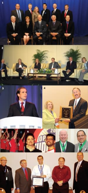 | 1. The new AOA Board of Trustees posed for their first group photo 2. Hosted by Joe Barr, OD, (left) a panel of Bausch & Lomb executives and ODs discussed the new Center for Patient Insights 3. Bob Woodruff, former ABC news exec and winner of the Peabody Award, was the keynote speaker at the Essilorsponsored Opening General Session 4. Dianne Sweet received her Paraoptometric of the Year plaque from Rick Weisbarth, OD 5. Team spirit overflowed at the Optometry Student Bowl 6. Essilor's Danne Ventura congratulates Student Bowl winner Aarlan Aceto from New England College of Optometry 7. National Hall of Fame recipients Edwin C. Marshall, OD, (left) and Charles Mullen, OD, joined ranks with 49 other ODs who have been named to the Hall of Fame for lifetime achievements in the profession 8. HOYA execs awarded recent graduate Brandon Mayes, OD, a $6,000 scholarship for his winning case study discussing how he fit an energetic 98-year-old with the Hoyalux Tact lenses |