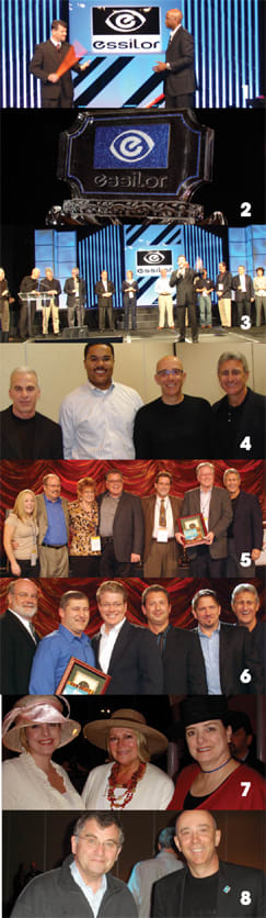 ![]() | 1. Essilor's Pete Hanlin and keynote speaker Robert Van Arlen entertain general session attendees; 2. The Essilor logo is carved in ice at the buffet table; 3. Essilor executives toasted success in 2009; 4. Essilor's Carl Bracy, Colin St. Clair, John Carrier, and Bob Colucci meet the press; 5. Walman Optical is recognized as an outstanding lab for 2008. Other top labs are Davis Vision, Central Optical, and Balester Optical; 6. Balester Optical is named Essilor's IDD Lab of the Year; 7. Hats are THE fashion accessory for the gala held at the Empire Polo Club; 8. Xavier Fontanet, Essilor International chairman and CEO, visits with EOA President John Carrier |
