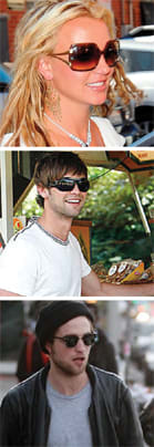 Gen Y celebs from top, Britney Spears in style Ga Ga Galore by Blinde; Chace Crawford in ck by Calvin Klein style ck3063s from Marchon; and Robert Pattinson in Ray-Ban's Clubmaster style RB 3016 from Luxottica |