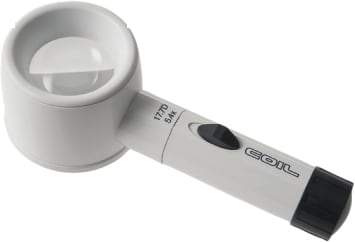 For nearly three decades, Hilco's COIL Raylite has set the standard for clinical low vision magnifiers. Raylites utilize aspheric lenses and are designed to give a highly illuminated, distortion-free viewing image. Battery operated handles are interchangeable with heads. Available in nine powers. (Image shown is 5.4x magnification,)