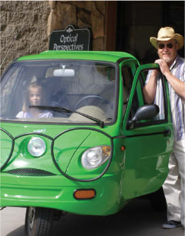 Richard Homeier, master optician and owner of Optical Perspectives in Estes Park, Colo., has an electronic vehicle that doubles as a moving billboard.