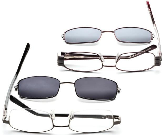 Flattering and wearable frame styles within the collection provide options for men and women in traditional and stylish colors, including satin black, dark gray, mocha, satin plum, matte dark coffee, and dark brown. The clip-ons echo the frames' coloration.