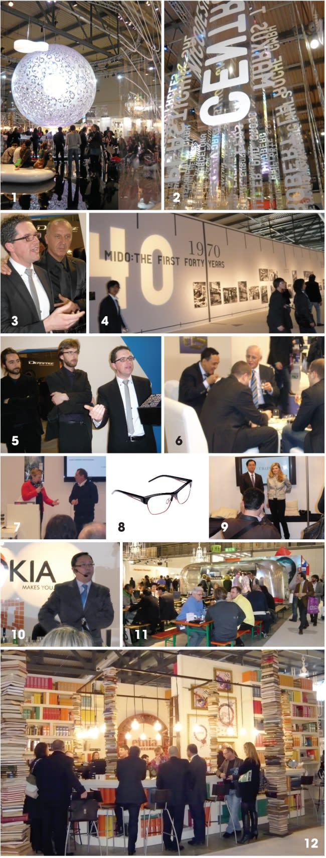 1. and 2. The Mido Design Lab remained open until 10 p.m. Saturday to celebrate the event's 40th anniversary; 3. Giovanni Bronca (right) from Italian eyewear parts manufacturer Grimont/shareholder of Pramaor titanium eyewear with Pramaor president Nicola Del Din at a press conference; 4. A timeline of Mido's 40 years of events; 5. At the Pramaor press conference, Del Din (far right) shows off the firm's latest products; 6. Socializing at the Polycore booth during a reception; 7. Representatives from PPG's NXT and French frame manufacturer Jublo announce the launch of the Falcon NXT lens and the RxTrem program in cooperation with Shamir's Portugal lab; 8. A neon splash from Orgreen; 9. Charmant and Trussardi announce their license agreement for Tru Trussardi and Trussardi 1911 eyewear collections; 10. Okia presents the latest in frame technology; 11. ic! Berlin cooks in a camper at its booth; 12. Etnia gets a studious look in a booth made of books |