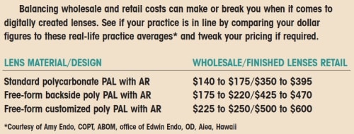 On the upside, there's seemingly no end to the designs that can be fabricated, which means there's a customized lens solution for all your patients. "We're utilizing free-form production in all facets of our operations," observes Steve Seibert, president of Three Rivers Optical in Pittsburgh, Pa. "Some examples are dual-side PAL designs, our private label backside PAL, specialty PAL designs, and special orders including lens designs that may be off the market now but that patients still want. Additionally, we're creating pristine lens surfaces for top-end ARs."