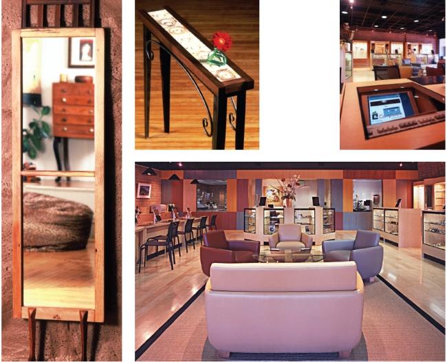 A luxury setting has signature styling that isn't found in every neighborhood dispensary, mixing new and antique, catalog and custom pieces. Shown clockwise from left: Artist Jeff Soderberg's mirror, Gazelle, and table, Rosette, Sonoma Eyework's reception desk and dispensary