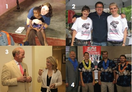 1. Unite for Sight volunteer Joleen Moore and a resident of Ghana; 2. Peter Friedfeld of ClearVision Optical flanked by makeup artists Reiva Cruze (l) and Jenni Kline (r) at the Komen NYC Race for the Cure; 3. FGX International CEO Alec Taylor and Corinne McCormack at the designer's newly renovated showroom in New York City; 4. (l to r) Optometry Giving Sight's Jim Price and optometrists Mark Kapperman, Troy White, and Rob McGarvey of Kapperman & White Eyecare at its Summer SPECtacular
