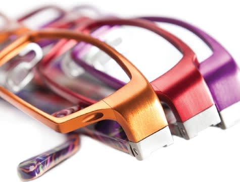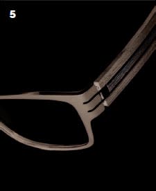 On the temples, the colors are strongest on the inside, with just a drop on the outside, achieved by milling away a small part of the upper layer of acetate. The styles are presented in two feminine shapes in six colors each, one unisex shape in five colors, and two masculine shapes in five colors each. One model in the aluminum and titanium combination (Malcolm X) comes in three colors.