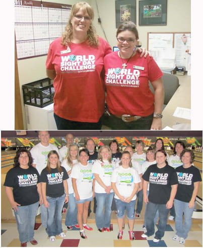 1. Family Eyecare Associates' Corey Gorman and Shellie Gray show off their World Sight Day Challenge T-Shirts; 2. Art Optical staff members, family, and friends held a bowling party to help raise funds for the World Sight Day Challenge |