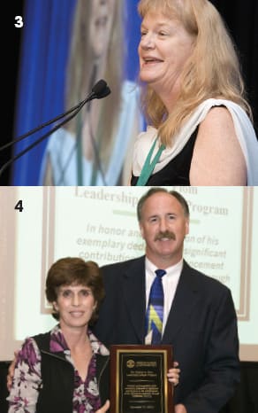 3. AAO's new president, Karla Zadnik, OD, PhD, FAAO; 4. Roanne Flom, daughter of Merton C. Flom, receives a plaque from Rick Weisbarth of CIBA VISION, long-time supporter of AAO's InSight Leadership program, which was renamed in honor of Merton C. Flom